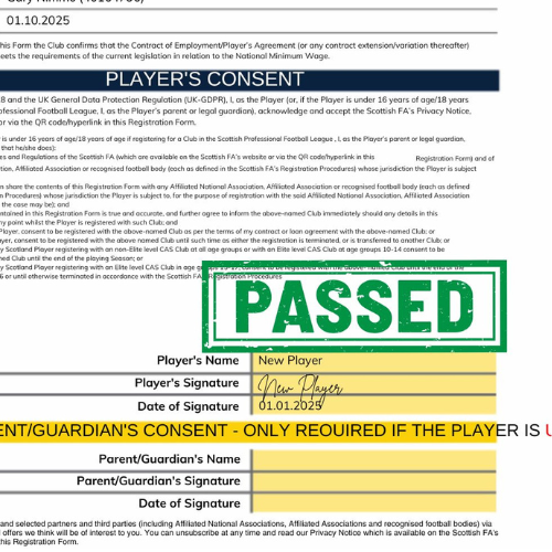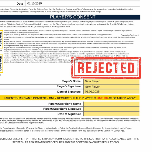 Please note the player is not classed as registered until this registration check has been completed by the Scottish FA, and a player returned as “Confirmed” on the Scottish FA Comet system and player has been catalogued to a competition to comply with SAFA Constitution and rules.